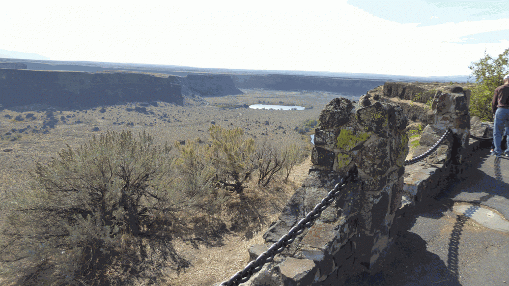 "Die Dry Falls (engl. für trockene Wasserfälle) sind eine geologische Formation im Grant Countyim US Bundesstaat Washington, die durch die Missaula Fluten am Ende der letzten Eiszeit entstanden ist. Die Dry Falls sind 5,6 km (3,5 Meilen) breit und 122 Meter (400 Fuß) hoch. Während der Fluten bildeten die Dry Falls den größten bekannten Wasserfall der Erdgeschichte. Der geschätzte Abfluss entsprach dem Zehnfachen aller heutigen Flüsse weltweit. Die großen Pools am Fuß der Fälle wurden durch die Fluten ausgehöhlt." (Quelle: Wikipedia