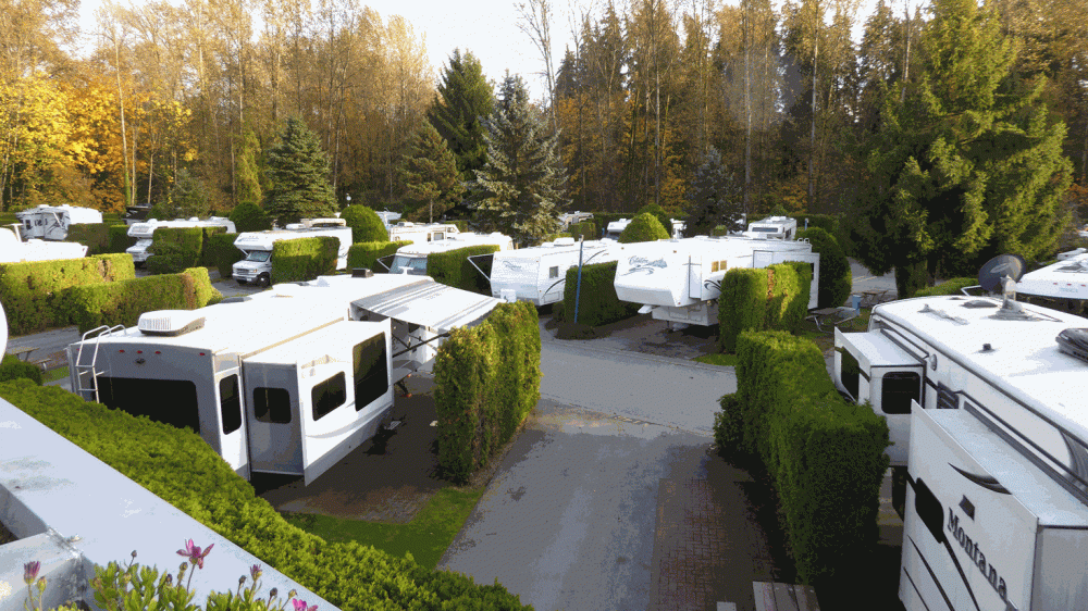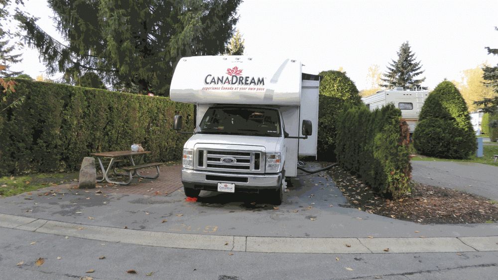 Jeder der 217 Stellplätze full hook up Plätze ist durch eine schmale Hecke vom Nachbarn getrennt.Der Preis je site: 68.00 can. $!! Der Vorteil dieses Platzes: die Erreichbarkeit von Downtown Vancouver mit Bus und Skytrain. Wir unternehmen einen Spaziergang über den Platz.